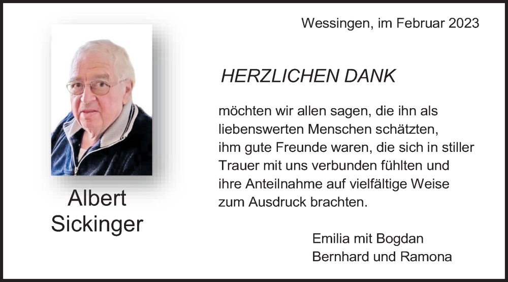 Hier finden Sie alle Traueranzeigen aus der Zeitung, die bisher für Albert Sickinger erschienen sind. Weitere Traueranzeigen, die in der Zeitung erscheinen, werden hier ebenfalls aufgelistet