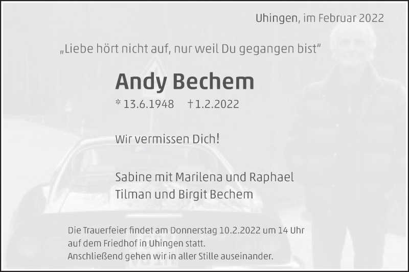 Hier finden Sie alle Traueranzeigen aus der Zeitung, die bisher für Andy Bechem erschienen sind. Weitere Traueranzeigen, die in der Zeitung erscheinen, werden hier ebenfalls aufgelistet
