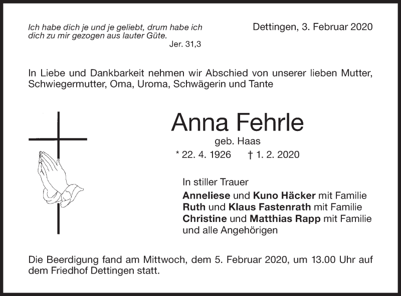 Hier finden Sie alle Traueranzeigen aus der Zeitung, die bisher für Anna Fehrle erschienen sind. Weitere Traueranzeigen, die in der Zeitung erscheinen, werden hier ebenfalls aufgelistet