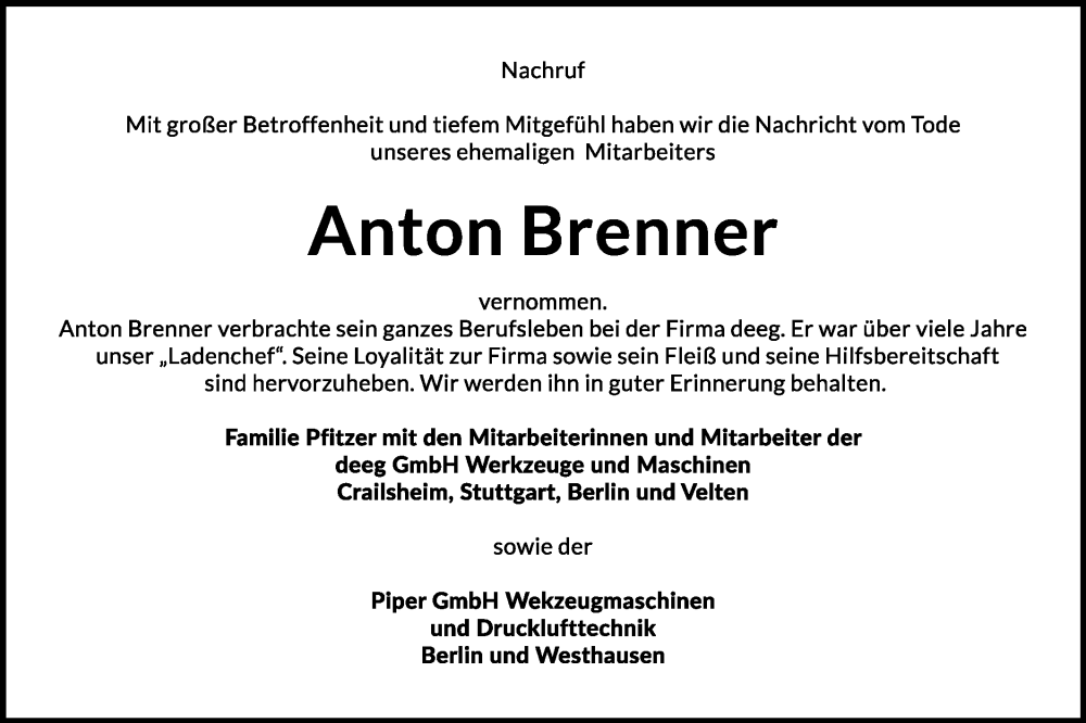 Hier finden Sie alle Traueranzeigen aus der Zeitung, die bisher für Anton Brenner erschienen sind. Weitere Traueranzeigen, die in der Zeitung erscheinen, werden hier ebenfalls aufgelistet
