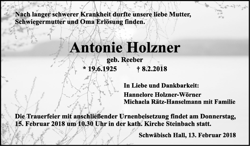 Hier finden Sie alle Traueranzeigen aus der Zeitung, die bisher für Antonie Holzner erschienen sind. Weitere Traueranzeigen, die in der Zeitung erscheinen, werden hier ebenfalls aufgelistet