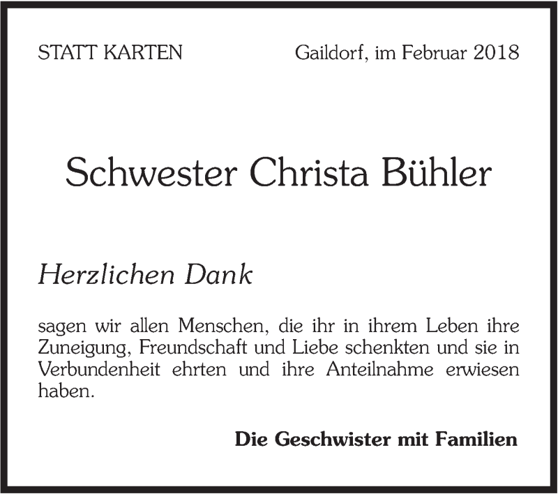 Hier finden Sie alle Traueranzeigen aus der Zeitung, die bisher für Christa Bühler erschienen sind. Weitere Traueranzeigen, die in der Zeitung erscheinen, werden hier ebenfalls aufgelistet