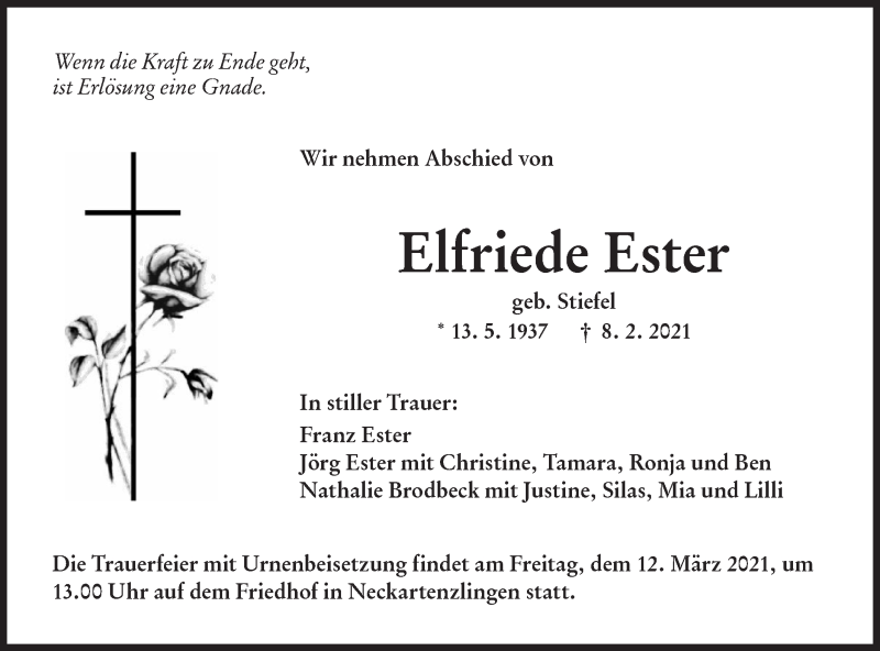 Hier finden Sie alle Traueranzeigen aus der Zeitung, die bisher für Elfriede Ester erschienen sind. Weitere Traueranzeigen, die in der Zeitung erscheinen, werden hier ebenfalls aufgelistet