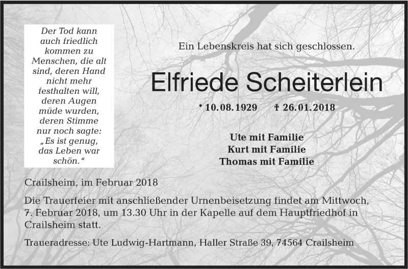 Hier finden Sie alle Traueranzeigen aus der Zeitung, die bisher für Elfriede Scheiterlein erschienen sind. Weitere Traueranzeigen, die in der Zeitung erscheinen, werden hier ebenfalls aufgelistet