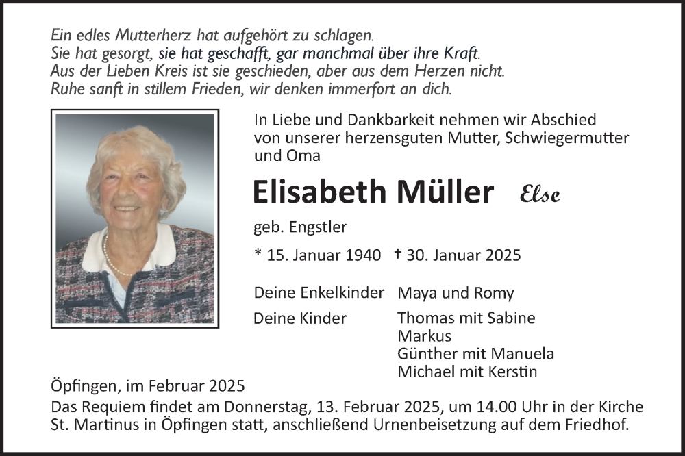 Hier finden Sie alle Traueranzeigen aus der Zeitung, die bisher für Elisabeth Müller erschienen sind. Weitere Traueranzeigen, die in der Zeitung erscheinen, werden hier ebenfalls aufgelistet