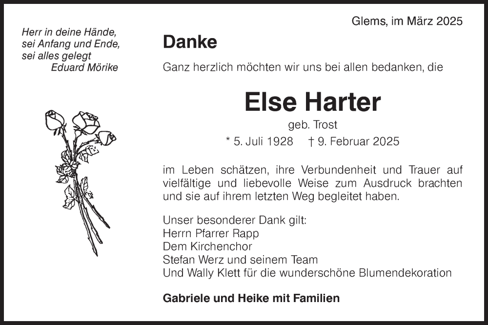 Hier finden Sie alle Traueranzeigen aus der Zeitung, die bisher für Else Harter erschienen sind. Weitere Traueranzeigen, die in der Zeitung erscheinen, werden hier ebenfalls aufgelistet