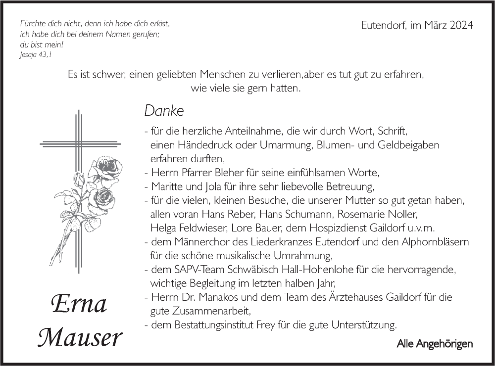 Hier finden Sie alle Traueranzeigen aus der Zeitung, die bisher für Erna Mauser erschienen sind. Weitere Traueranzeigen, die in der Zeitung erscheinen, werden hier ebenfalls aufgelistet