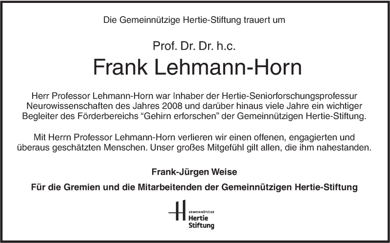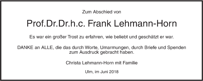 Hier finden Sie alle Traueranzeigen aus der Zeitung, die bisher für Frank Lehmann-Horn erschienen sind. Weitere Traueranzeigen, die in der Zeitung erscheinen, werden hier ebenfalls aufgelistet