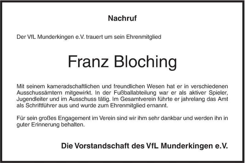 Hier finden Sie alle Traueranzeigen aus der Zeitung, die bisher für Franz Bloching erschienen sind. Weitere Traueranzeigen, die in der Zeitung erscheinen, werden hier ebenfalls aufgelistet