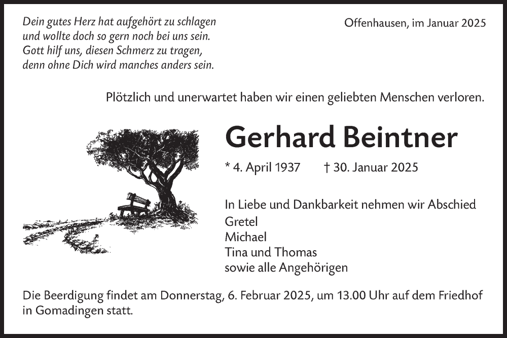 Hier finden Sie alle Traueranzeigen aus der Zeitung, die bisher für Gerhard Beintner erschienen sind. Weitere Traueranzeigen, die in der Zeitung erscheinen, werden hier ebenfalls aufgelistet