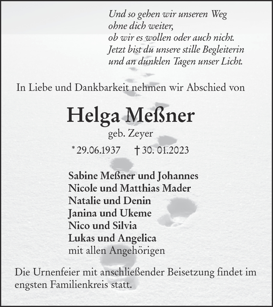 Hier finden Sie alle Traueranzeigen aus der Zeitung, die bisher für Helga Meßner erschienen sind. Weitere Traueranzeigen, die in der Zeitung erscheinen, werden hier ebenfalls aufgelistet