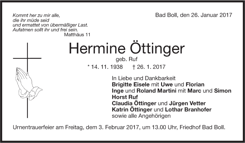 Hier finden Sie alle Traueranzeigen aus der Zeitung, die bisher für Hermine Öttinger erschienen sind. Weitere Traueranzeigen, die in der Zeitung erscheinen, werden hier ebenfalls aufgelistet