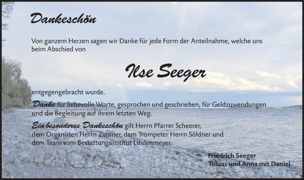 Hier finden Sie alle Traueranzeigen aus der Zeitung, die bisher für Ilse Seeger erschienen sind. Weitere Traueranzeigen, die in der Zeitung erscheinen, werden hier ebenfalls aufgelistet