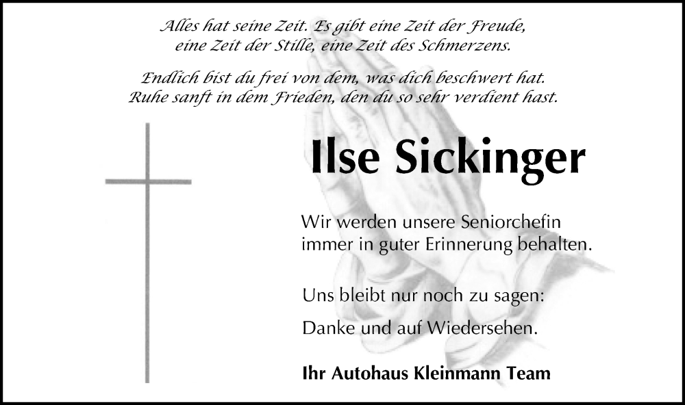 Hier finden Sie alle Traueranzeigen aus der Zeitung, die bisher für Ilse Sickinger erschienen sind. Weitere Traueranzeigen, die in der Zeitung erscheinen, werden hier ebenfalls aufgelistet