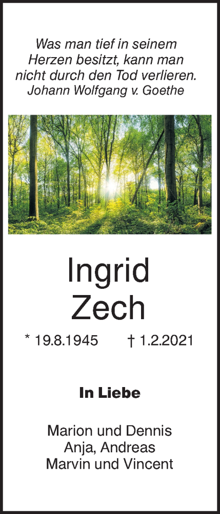 Hier finden Sie alle Traueranzeigen aus der Zeitung, die bisher für Ingrid Zech erschienen sind. Weitere Traueranzeigen, die in der Zeitung erscheinen, werden hier ebenfalls aufgelistet