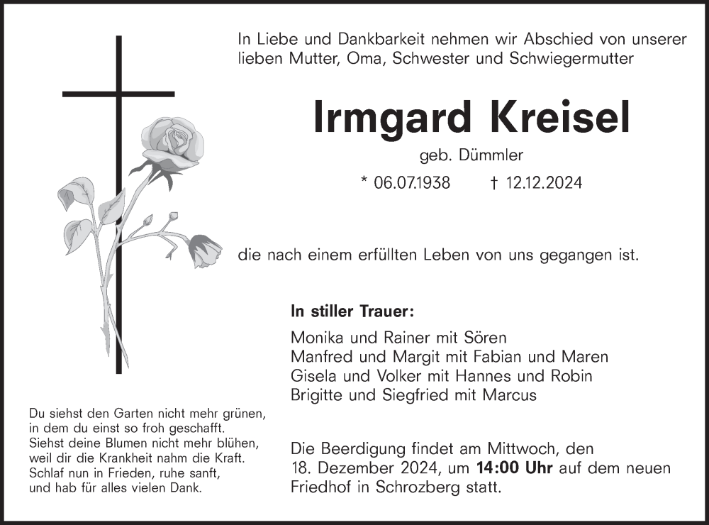 Hier finden Sie alle Traueranzeigen aus der Zeitung, die bisher für Irmgard Kreisel erschienen sind. Weitere Traueranzeigen, die in der Zeitung erscheinen, werden hier ebenfalls aufgelistet