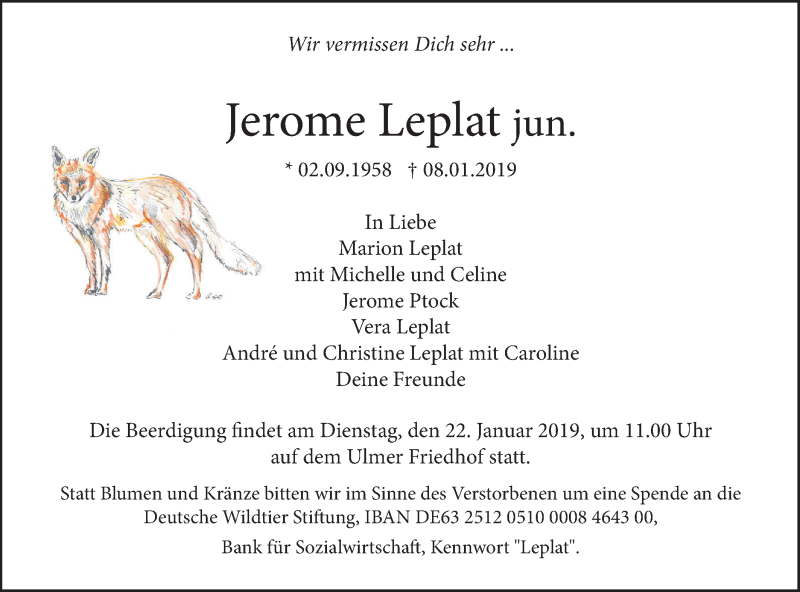 Hier finden Sie alle Traueranzeigen aus der Zeitung, die bisher für Jerome Leplat erschienen sind. Weitere Traueranzeigen, die in der Zeitung erscheinen, werden hier ebenfalls aufgelistet