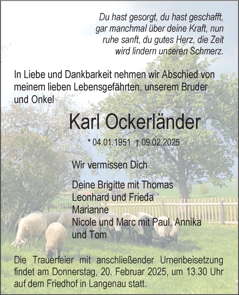 Hier finden Sie alle Traueranzeigen aus der Zeitung, die bisher für Karl Ockerländer erschienen sind. Weitere Traueranzeigen, die in der Zeitung erscheinen, werden hier ebenfalls aufgelistet