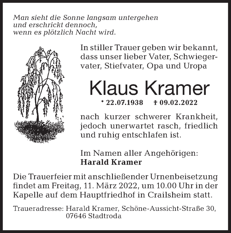 Hier finden Sie alle Traueranzeigen aus der Zeitung, die bisher für Klaus Kramer erschienen sind. Weitere Traueranzeigen, die in der Zeitung erscheinen, werden hier ebenfalls aufgelistet