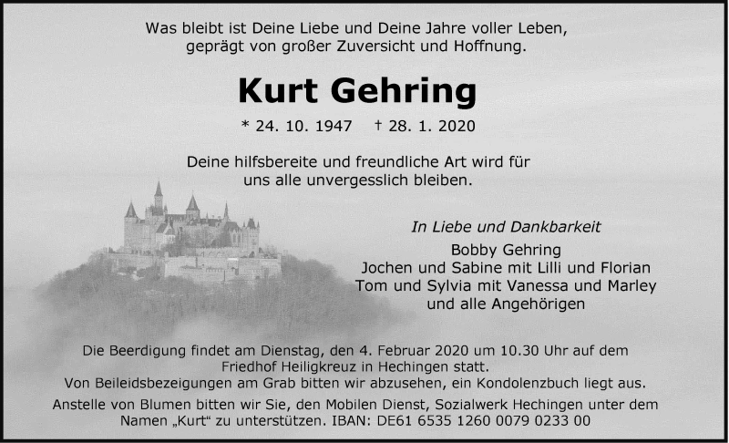 Hier finden Sie alle Traueranzeigen aus der Zeitung, die bisher für Kurt Gehring erschienen sind. Weitere Traueranzeigen, die in der Zeitung erscheinen, werden hier ebenfalls aufgelistet