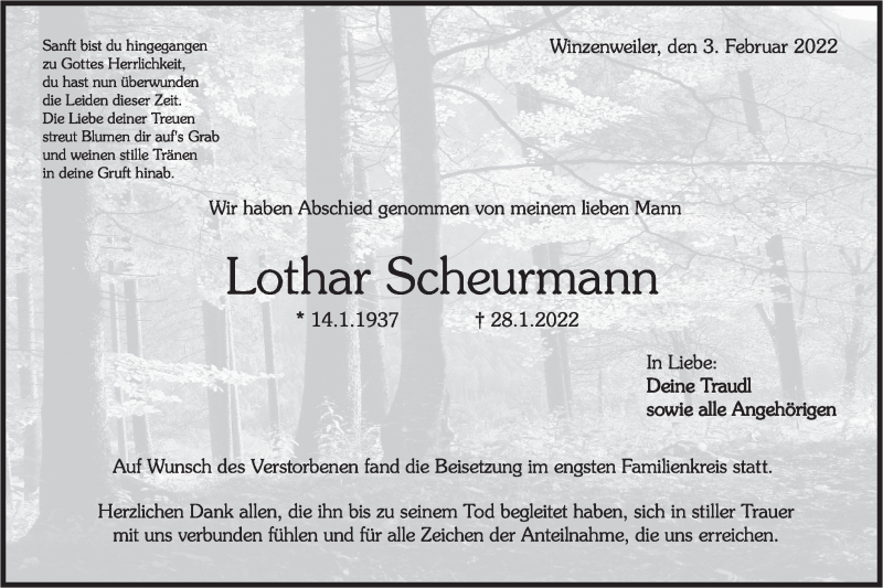 Hier finden Sie alle Traueranzeigen aus der Zeitung, die bisher für Lothar Scheurmann erschienen sind. Weitere Traueranzeigen, die in der Zeitung erscheinen, werden hier ebenfalls aufgelistet