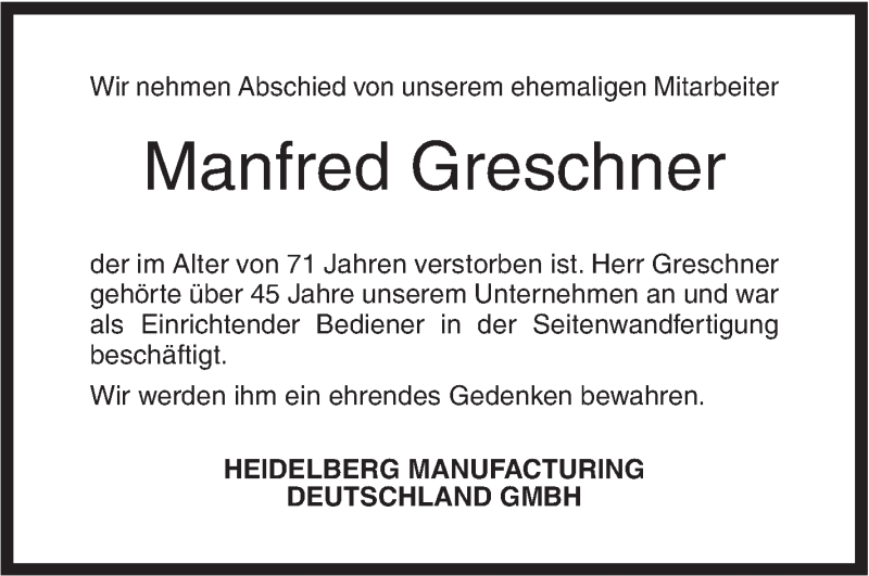 Hier finden Sie alle Traueranzeigen aus der Zeitung, die bisher für Manfred Greschner erschienen sind. Weitere Traueranzeigen, die in der Zeitung erscheinen, werden hier ebenfalls aufgelistet