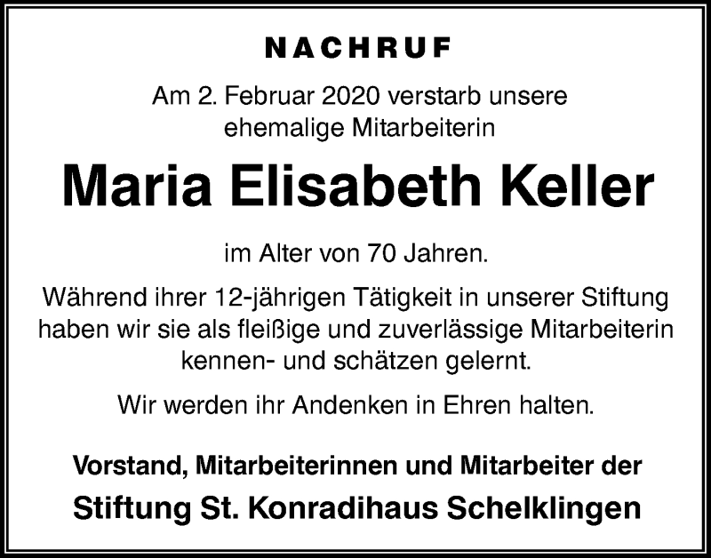 Hier finden Sie alle Traueranzeigen aus der Zeitung, die bisher für Maria Elisabeth Keller erschienen sind. Weitere Traueranzeigen, die in der Zeitung erscheinen, werden hier ebenfalls aufgelistet