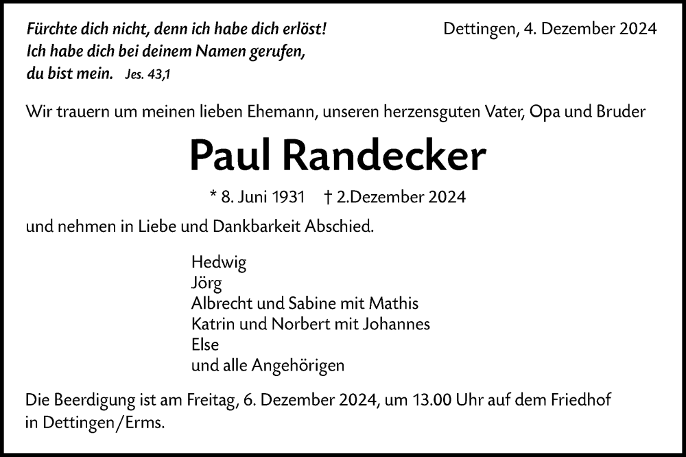 Hier finden Sie alle Traueranzeigen aus der Zeitung, die bisher für Paul Randecker erschienen sind. Weitere Traueranzeigen, die in der Zeitung erscheinen, werden hier ebenfalls aufgelistet