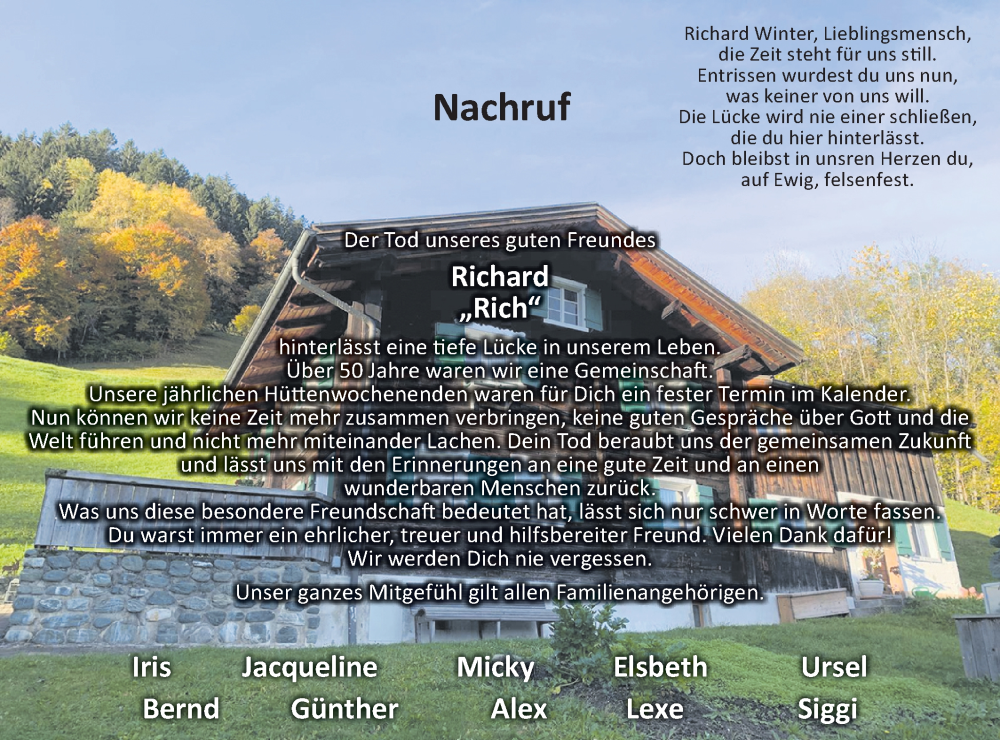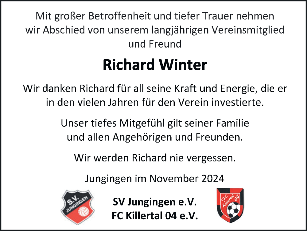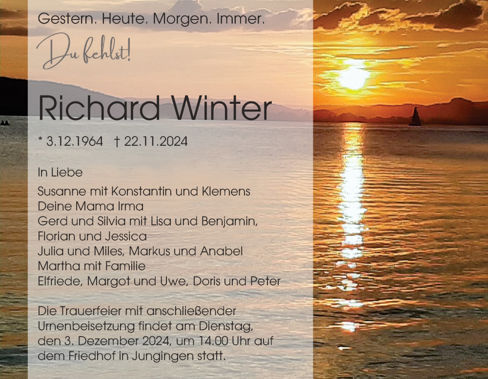 Hier finden Sie alle Traueranzeigen aus der Zeitung, die bisher für Richard Winter erschienen sind. Weitere Traueranzeigen, die in der Zeitung erscheinen, werden hier ebenfalls aufgelistet