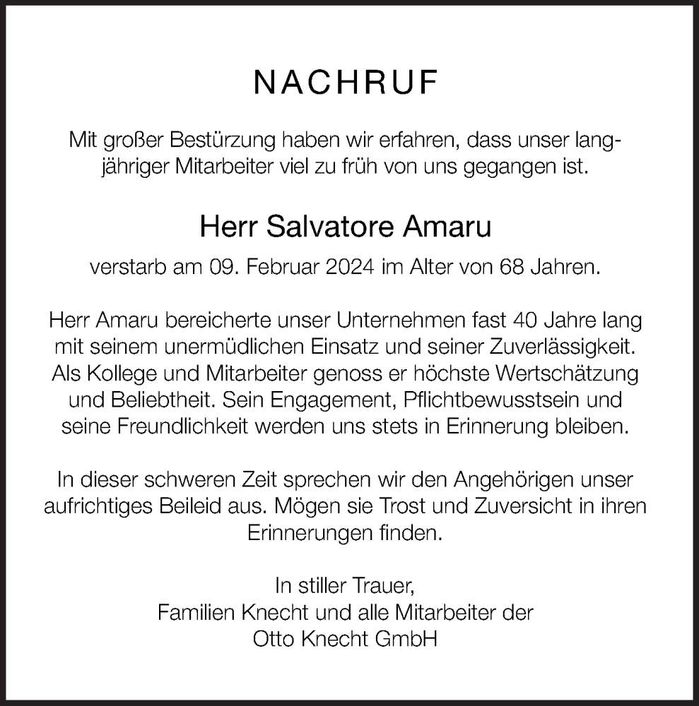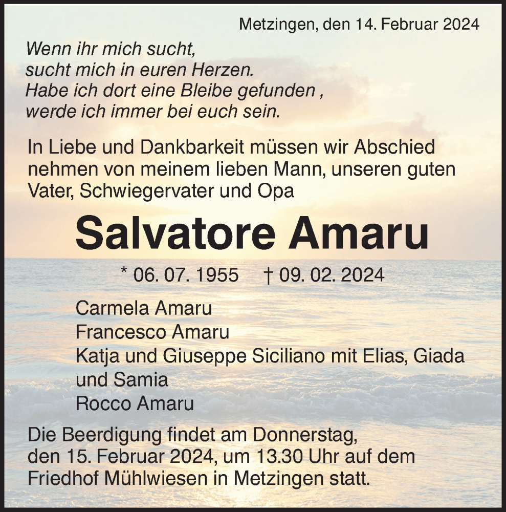 Hier finden Sie alle Traueranzeigen aus der Zeitung, die bisher für Salvatore Amaru erschienen sind. Weitere Traueranzeigen, die in der Zeitung erscheinen, werden hier ebenfalls aufgelistet