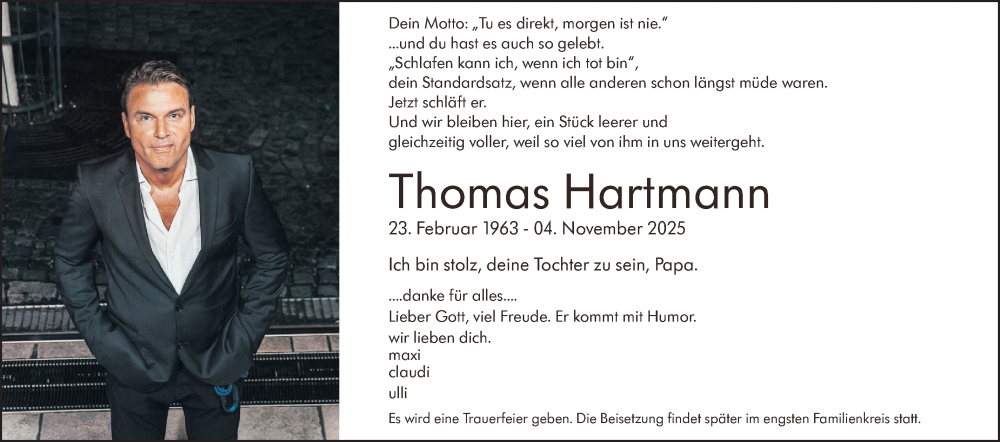 Hier finden Sie alle Traueranzeigen aus der Zeitung, die bisher für Thomas Hartmann erschienen sind. Weitere Traueranzeigen, die in der Zeitung erscheinen, werden hier ebenfalls aufgelistet