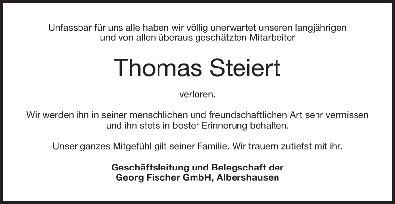 Hier finden Sie alle Traueranzeigen aus der Zeitung, die bisher für Thomas Steiert erschienen sind. Weitere Traueranzeigen, die in der Zeitung erscheinen, werden hier ebenfalls aufgelistet