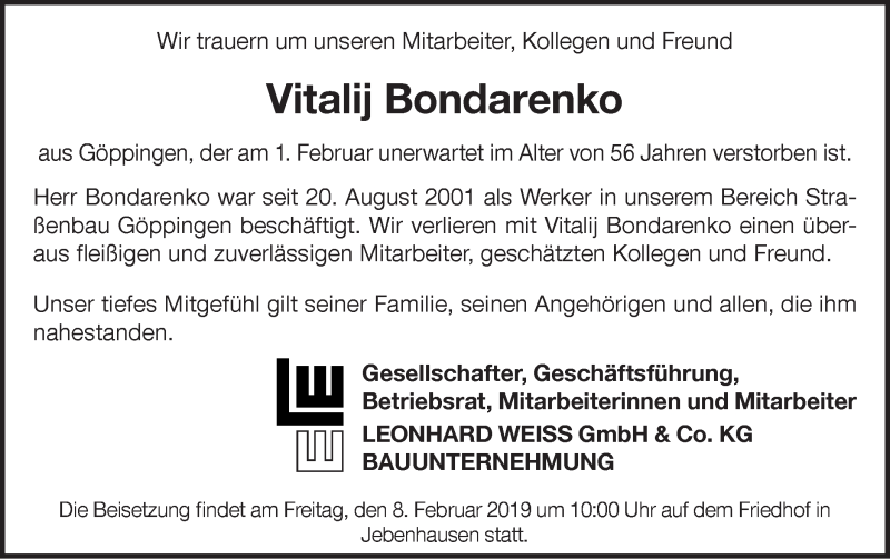 Hier finden Sie alle Traueranzeigen aus der Zeitung, die bisher für Vitalij Bondarenko erschienen sind. Weitere Traueranzeigen, die in der Zeitung erscheinen, werden hier ebenfalls aufgelistet