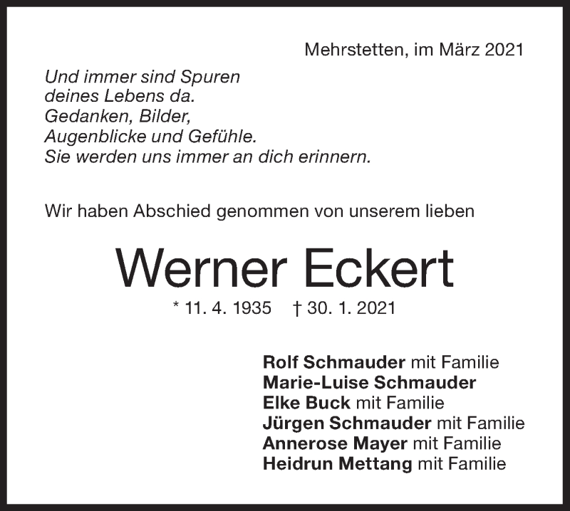 Hier finden Sie alle Traueranzeigen aus der Zeitung, die bisher für Werner Eckert erschienen sind. Weitere Traueranzeigen, die in der Zeitung erscheinen, werden hier ebenfalls aufgelistet
